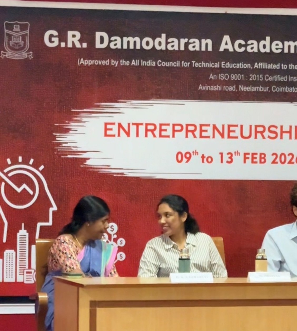 Dhanyaa- 25MLS007 (I MBA – LSCM,) was invited as the Chief Guest for an MBA event at GRDAM, Coimbatore. Initially nervous, she soon gained confidence as the program progressed. Prior to the event, she interacted with the Principal and Heads of Department, sharing her entrepreneurial journey with her startup The WHISK and how she balances business operations alongside academics.